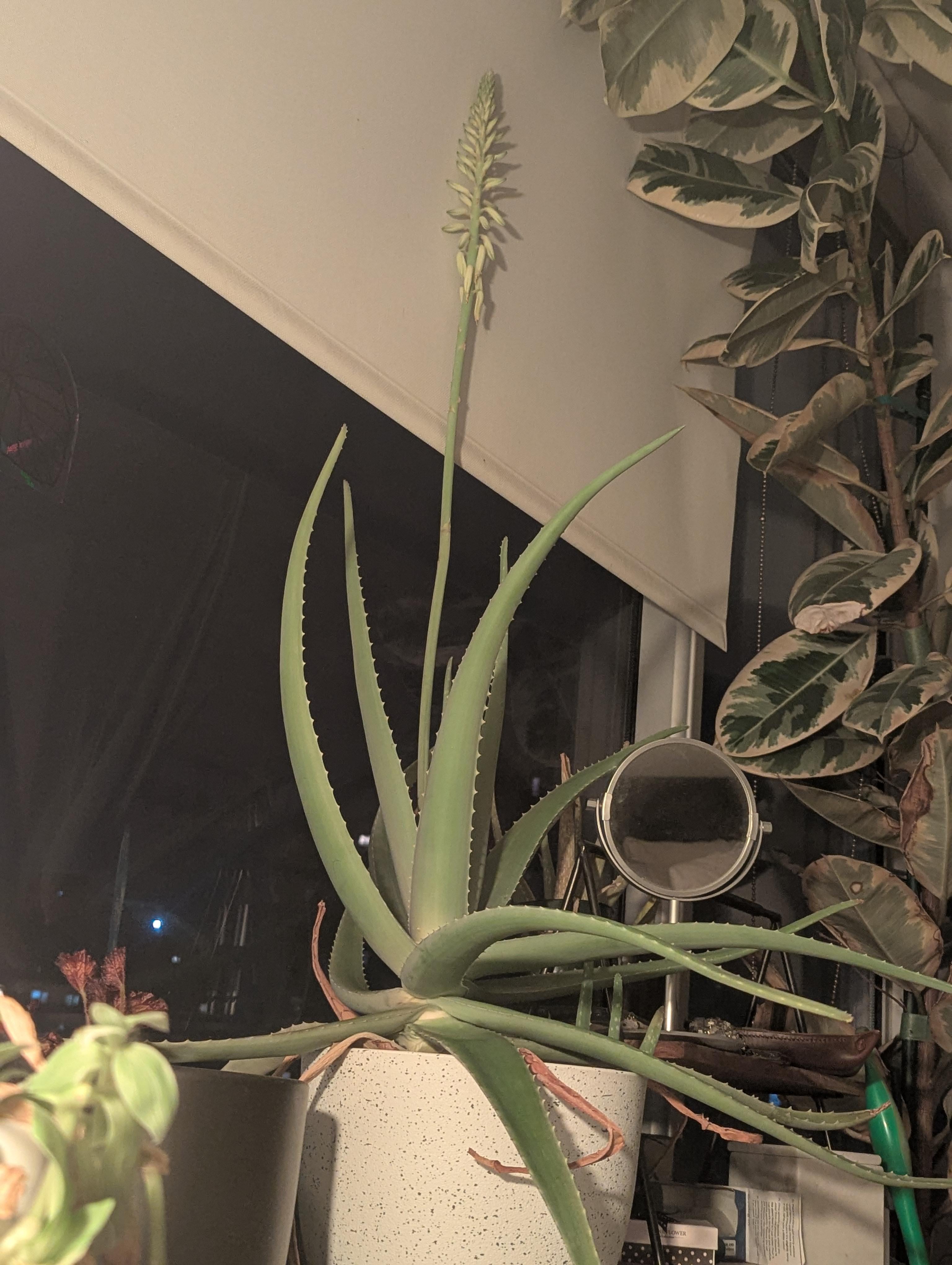 8年間飼っていたアロエが突然花柄を出してしまいました?!これですか?真っ赤かオレンジ色に色が変わるのを期待していたのですが、しおれてきているように見えます😞