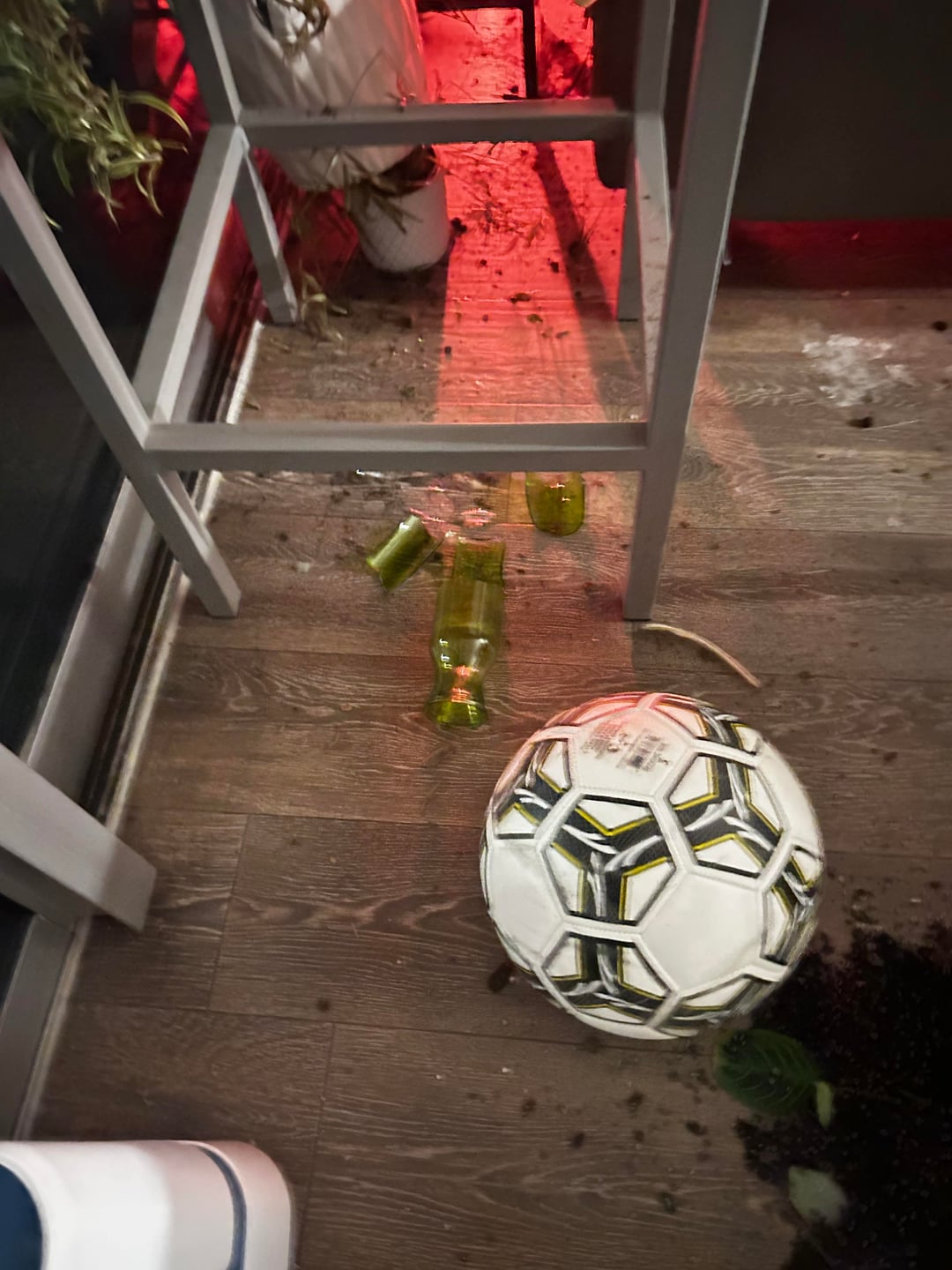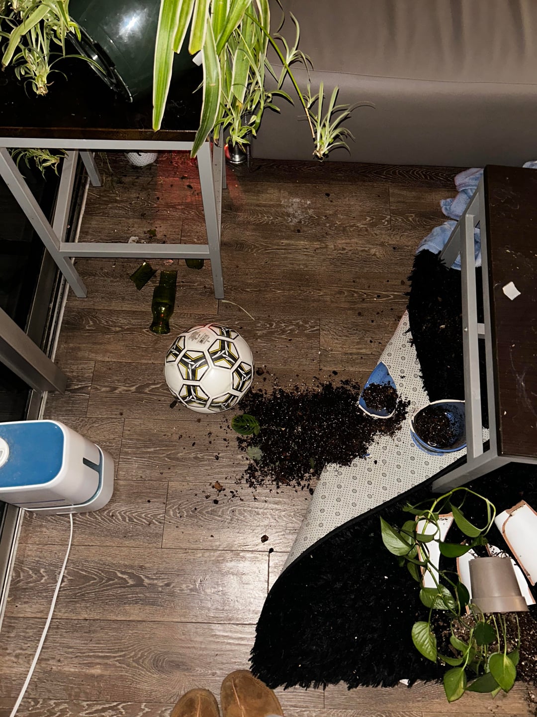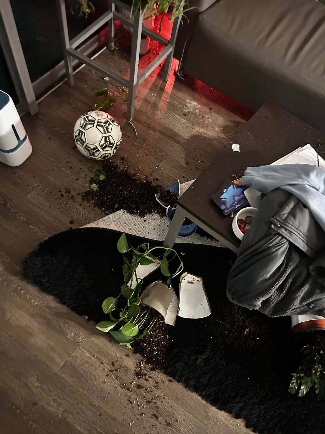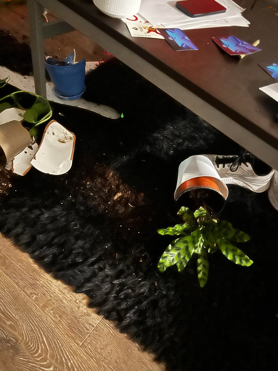 仕事を終えて午前1時頃に帰宅すると、共用リビングルームの床には割れた鍋、いたるところに土が散らばり、割れたガラスや陶器が散乱していました。何もきれいになりませんでした。私が対処するためにそこを去っただけです。窓にはゲロのようなものも残っていました。