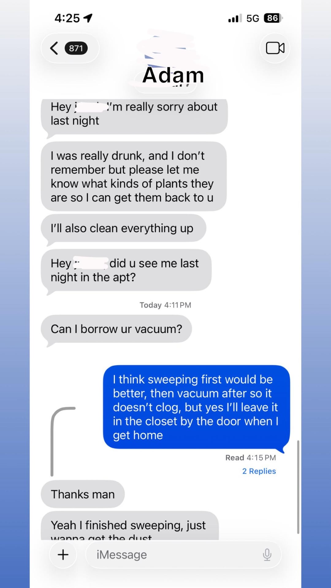 翌日、彼は私にテキストメッセージを送り、本当に酔っていて覚えていない、植物を交換するためにどのような植物なのか尋ね、すべてをきれいにすると言いました。彼は後で直接謝罪もしたが、誠実なようだった。