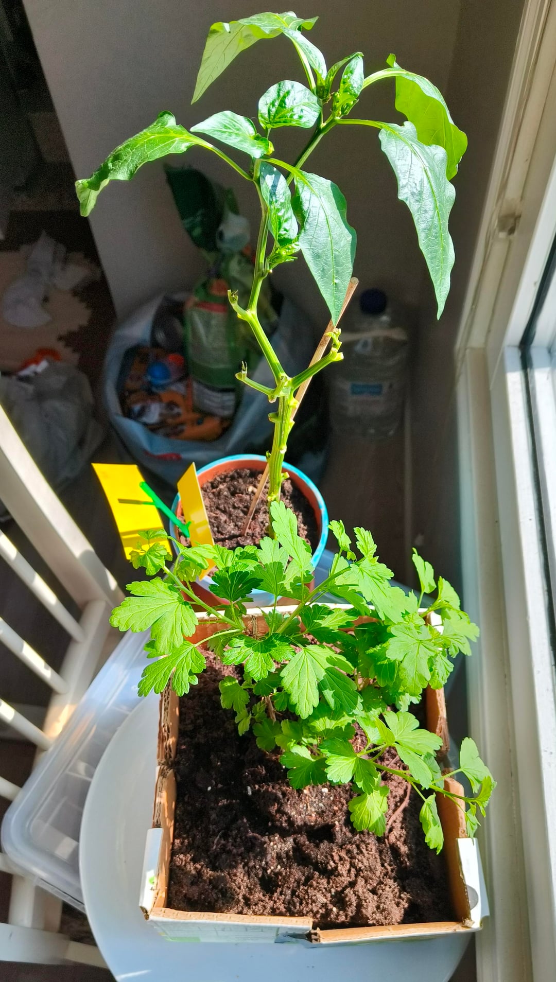 また、写真にあるのは、リサイクルショップの外に誰かにあげるためにいくつか残していた、ランダムな人からもらったピーマンの植物です。小さなピーマンを作った後、昨年の冬に厄介な病気にかかり、健康な葉を1枚だけ残して生き延びました😬