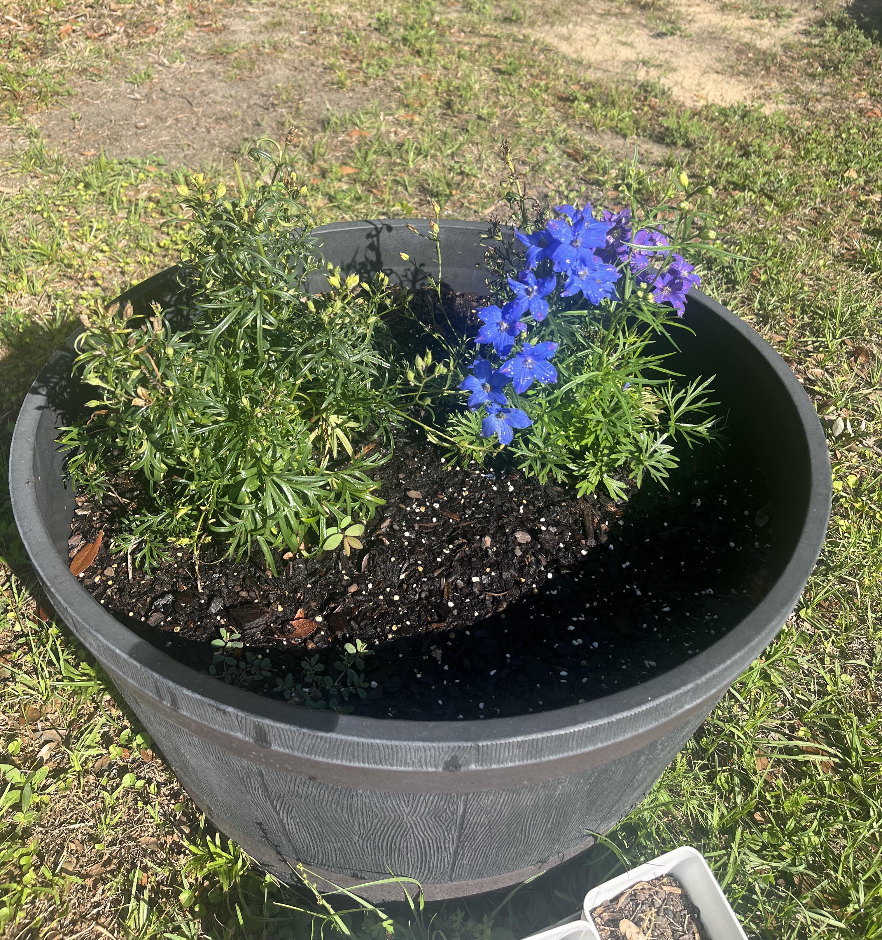 フロリダ州ペンサコーラ近郊在住。 3月上旬にデルフィニウムを用土に植えました。午前7時から午後4時頃までは太陽の光がたっぷり当たります。毎日、帰宅後の午後2時から3時頃に水やりをしています。咲いているのは鉢の北東側、咲いていないのは南西側です。咲いていない方の株には蕾がついていますが、もう一方の株は開きつつありますが、乾燥し続けているようです。何かアドバイスはありますか? 若いデルフィニウムの剪定に関するアドバイスにも興味があります。