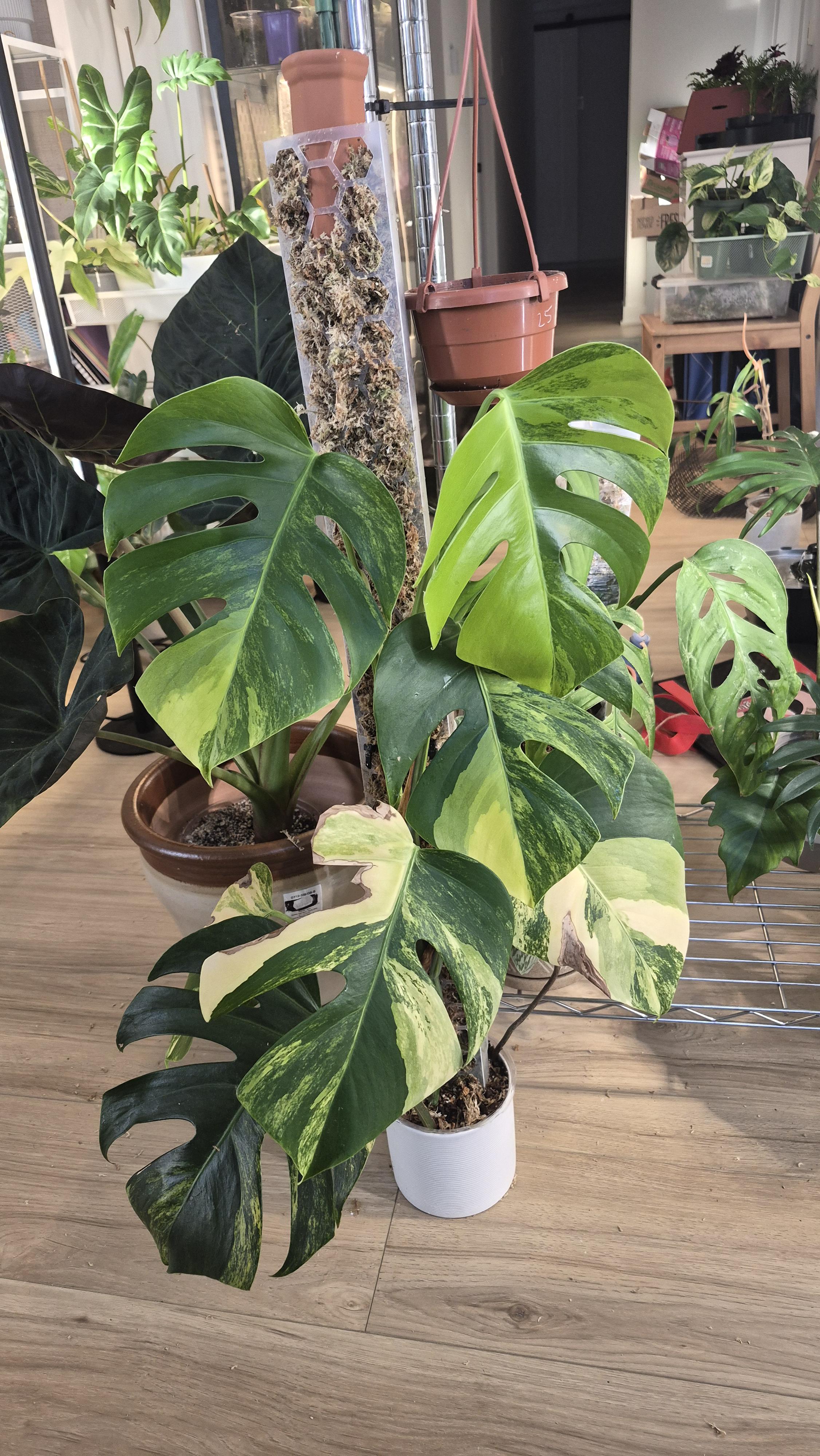 一年ほど前から苔のポールで育てています。少し前に拡張しましたが、加湿器を彼女に向けて正面に置き、周囲60%で成長しています。最新の葉は半分黄色です😌😌