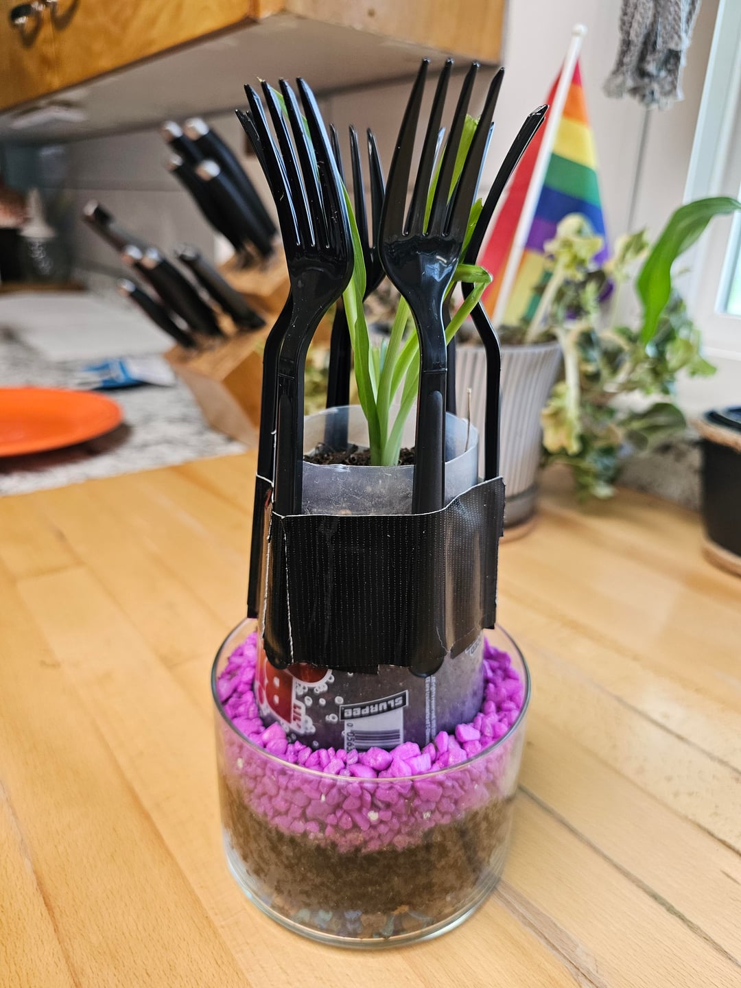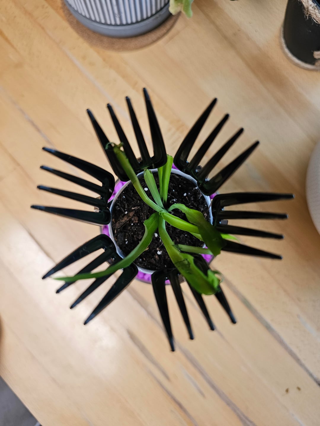クモの植物をトピアリーに育てようとしています。すべてがうまくいっていましたが、猫が窓に忍び込んで先端をすべてかじってしまいました。 さて、私はこのクモの植物にカスタム防御システムを装備して、次回は猫に考え直してもらいました。 😅