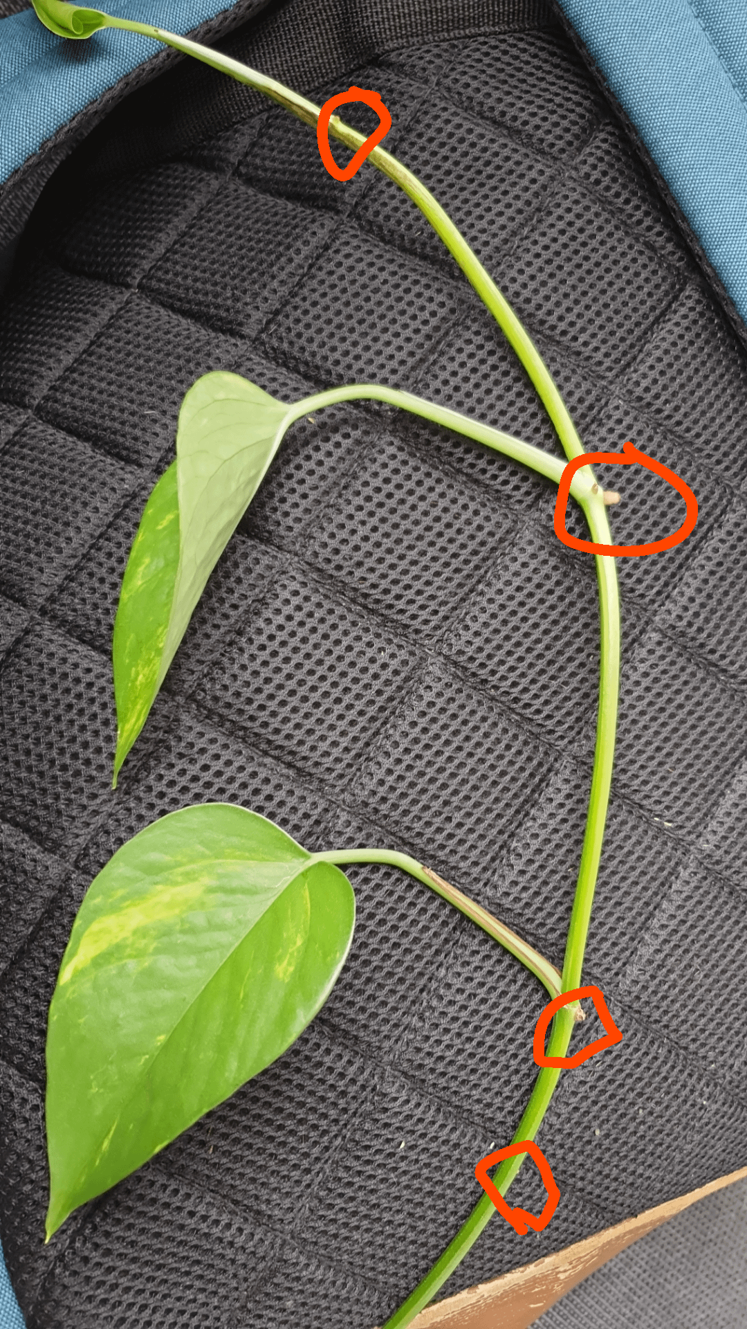 私はこの分野は初心者ですが、インターネットで調べたところ、上部と下部はそれぞれ独立した植物として機能するはずです。しかし、空気根(赤色)が葉の真下にある中央部分はどうでしょうか。この挿し木を切って、3 つの新しい植物を作ることはできますか。ちなみに、この挿し木は母のツタ植物から取ったもので、母もこれまで一度も増やしたことがありません。