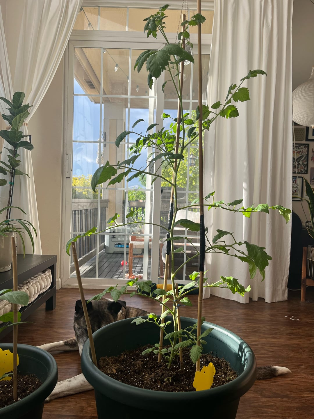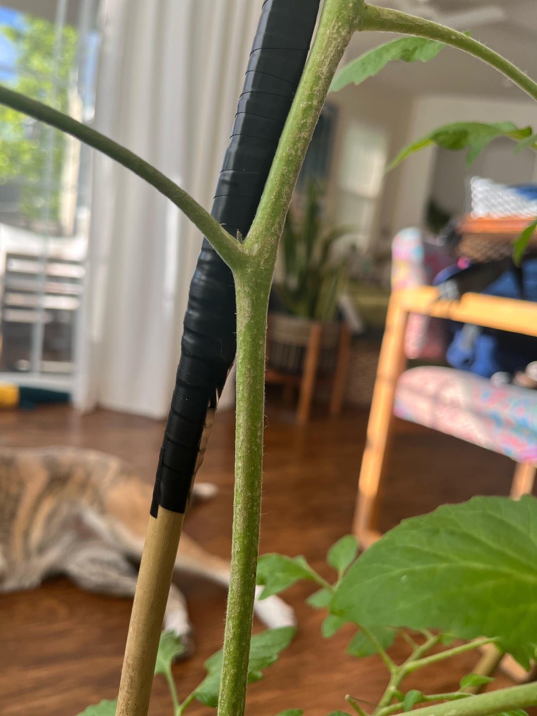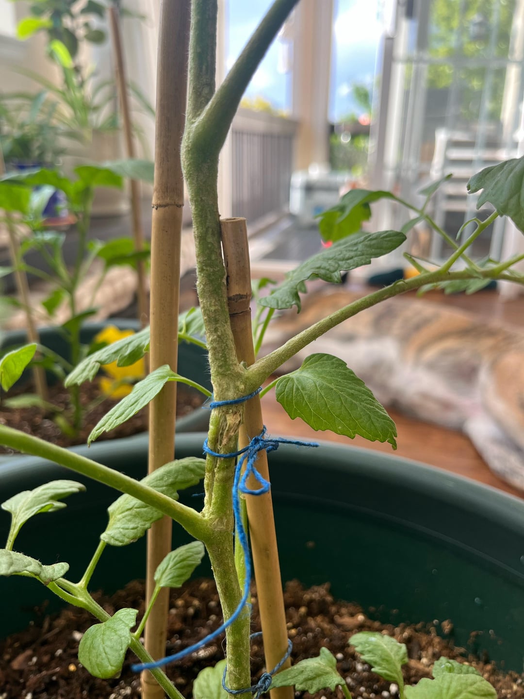 みなさん、こんにちは!トマトを育てるのは初めてで、ある風の強い日に家に帰ると茎が曲がっていました(1枚目の写真)。支えはしてあるのでまだ大丈夫そうですが、茎に斑点がいくつかあったので心配になってきました。大丈夫だと思いますか?