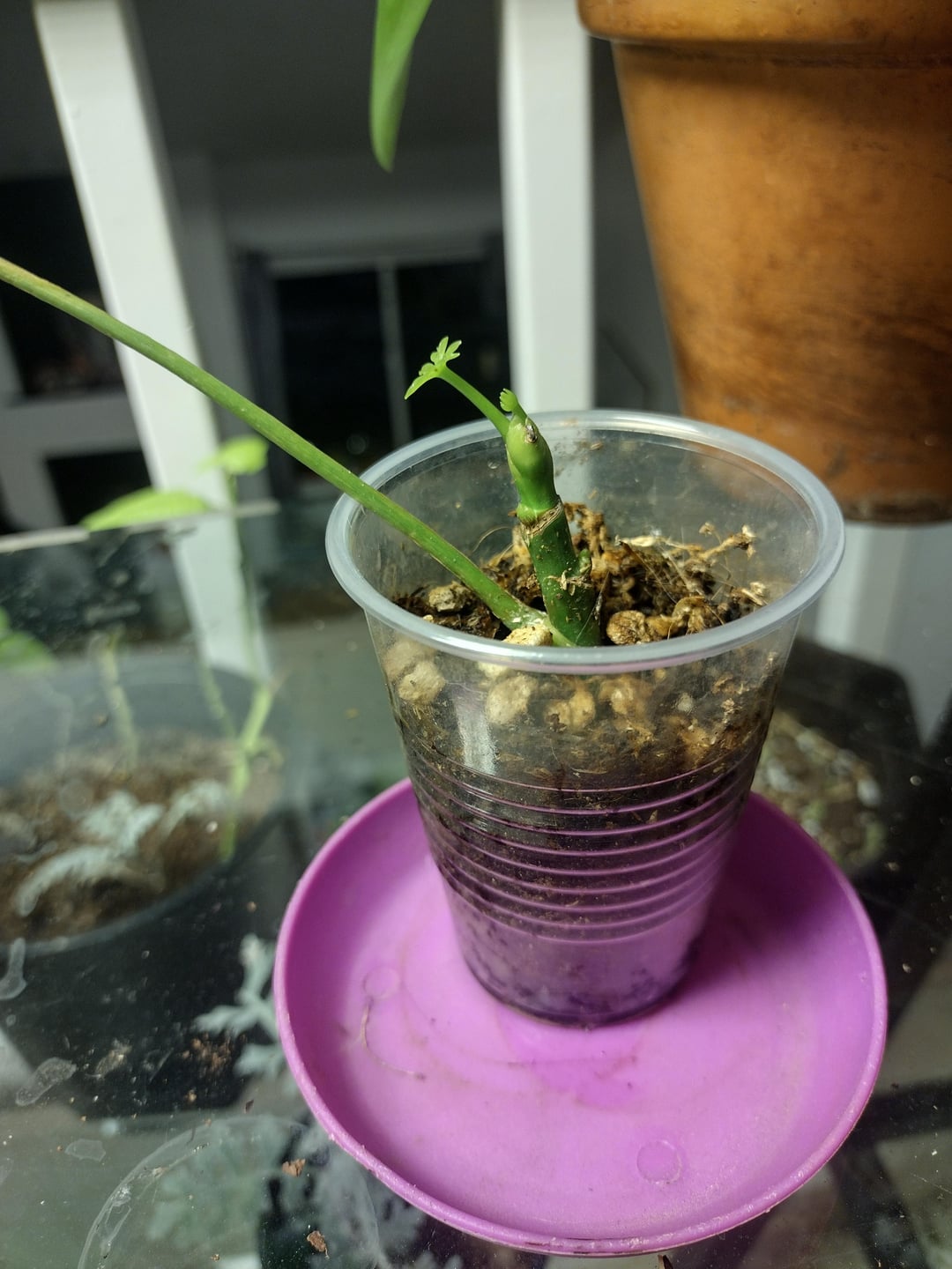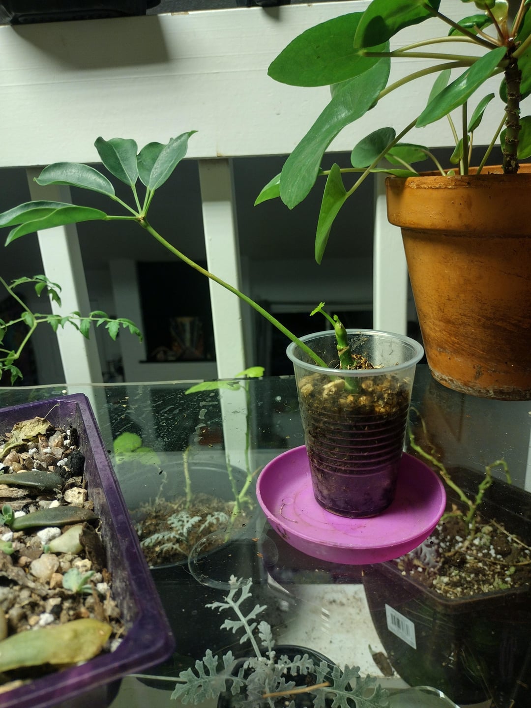 (フィルムと怖い後ろの端をすみません。ガラスクリーナーがなくなったので、間違いなく大きなガラスのテーブルトップを使って植物を立てました。壊れた端はかなり直角に整えられており、安全のために手すりにも当てられています。また、ここは私の間に合わせの植物のセットアップの「集中治療」コーナーです。ほとんどが小道具と救助です。後ろにある悲しいサポメアはご容赦ください(笑)) 今年の7月初旬、私は私の家の近くのゴミ箱で7フィートの編み込みシェフレラを見つけましたが、無残にもしおれて覆われていました。ハダニの中で。 通常、私はそのような害虫のリスクを負いませんが、お金がありませんし、私のコレクションはすでに進行中のハダニの蔓延と戦っていました。そして、どうしてもシェフレラが欲しかったのです! そこで私は、望みも無く唯一生き残った小枝を切り、ダニよけの処理をし、屋内に持ち込んで水に浸しました。 それは嫌でした。 それは私を嫌っていました。 私が始めたとき、それは3つの成熟した扇と8インチの茎を持っていました、そして私がそれをねじ込むと言って土を試すことにしたときまでに、それはここに見られる1枚の成熟した葉と悲しい小さな棒にまで減少しました、それがなければ完全に不毛でした…私はほとんど希望を諦め、8月と9月に何度か諦めました。 しかし、私は粘り強いものではなく、4か月かけてゆっくりと光を増やし、バランスを見つけた後、ついに彼女は私に2人の小さな新しいファンを与えてくれました!!! 💕🥹🌱
