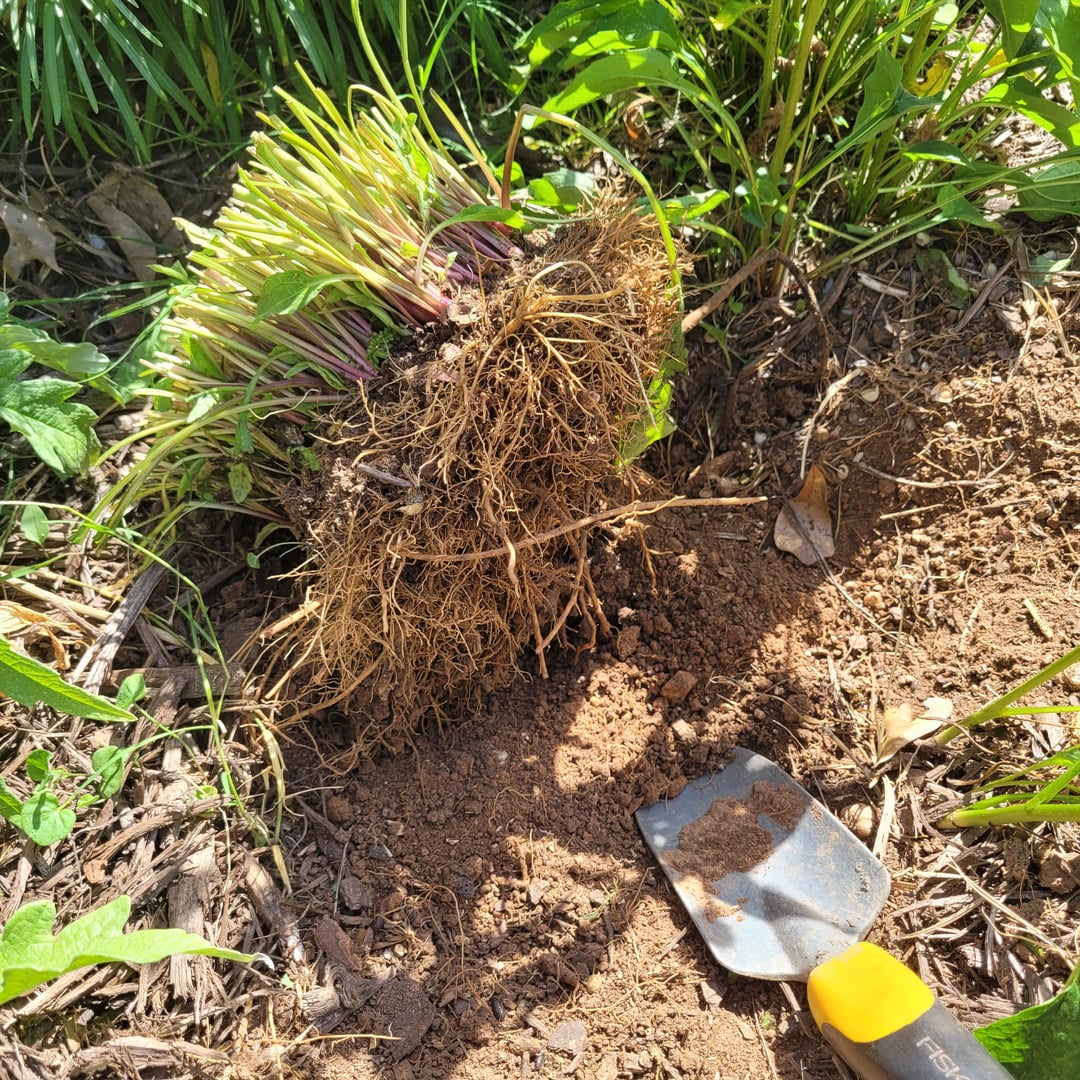 (4 & 5) 植物の大部分を取り除いた後、根塊の端を見つけるために掘り返しました。私の植物の根はとても浅いことがわかりました。