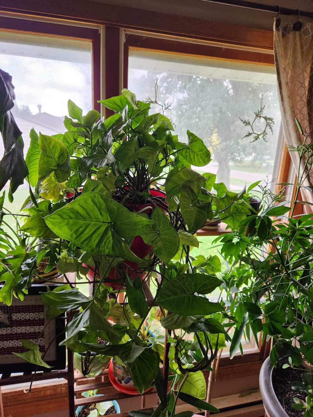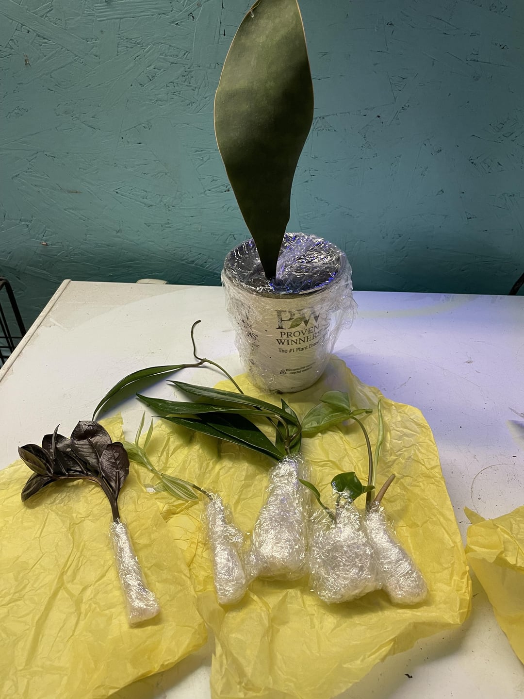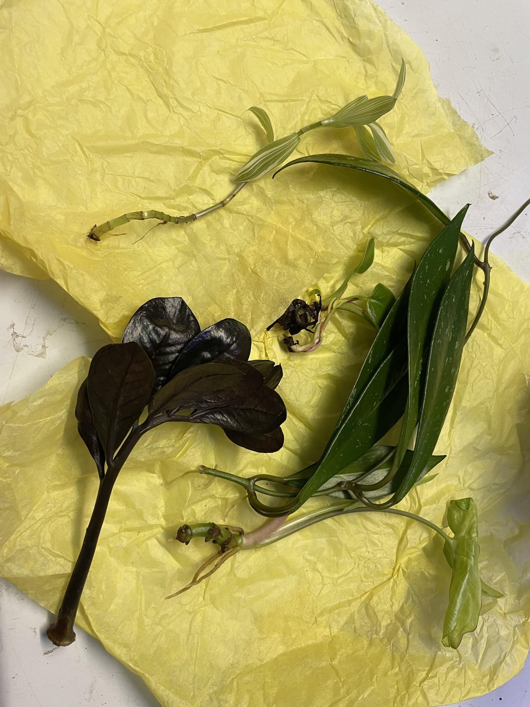 謎のウィッシュデイボックスの挿し木を入手しました! これは私が唯一確信が持てないものの母植物です。 これはタロイモですか? 一番右にいるのが赤ちゃんです。 2枚目の写真左から右へ: ZZ、Tradescantia fluminensis ‘Albovittata、Hoya、Birkin、??? タロイモ?、トップクジラのヒレ。