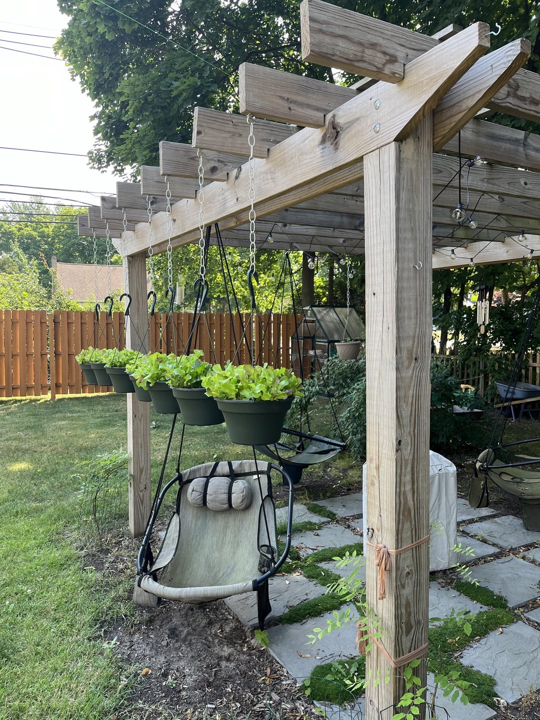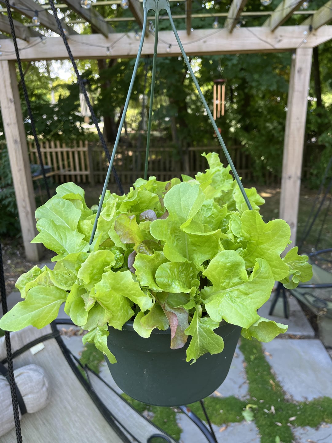 地面で葉物野菜を育てるのは難しかったのですが、ホームデポでハンギングバスケットに入ったレタスが売られているのを見て、試してみようと思いました。ちなみに、私は自分で種から育てました。アイデアを盗んだだけです。