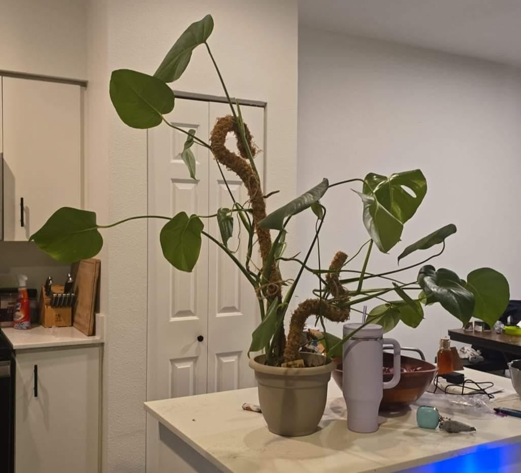このモンステラについて少しアドバイスが必要です。傷つけるのが怖くて、窓際に置いて1年間動かさないようにしていました。やっと窓から引き抜いて支柱を立てて形を整えたのですが、かなり蔓が張っていて、右側の茎が曲がっているのがわかりました。どの程度慎重に育て直せばいいのでしょうか。ここまで育てた後にストレスを与えて枯らしたくはありません。どんな助言、アドバイス、提案、批判でも歓迎します。これは私の最初のモンステラで、正直ここまで育てられるとは思っていませんでした。よろしくお願いします!