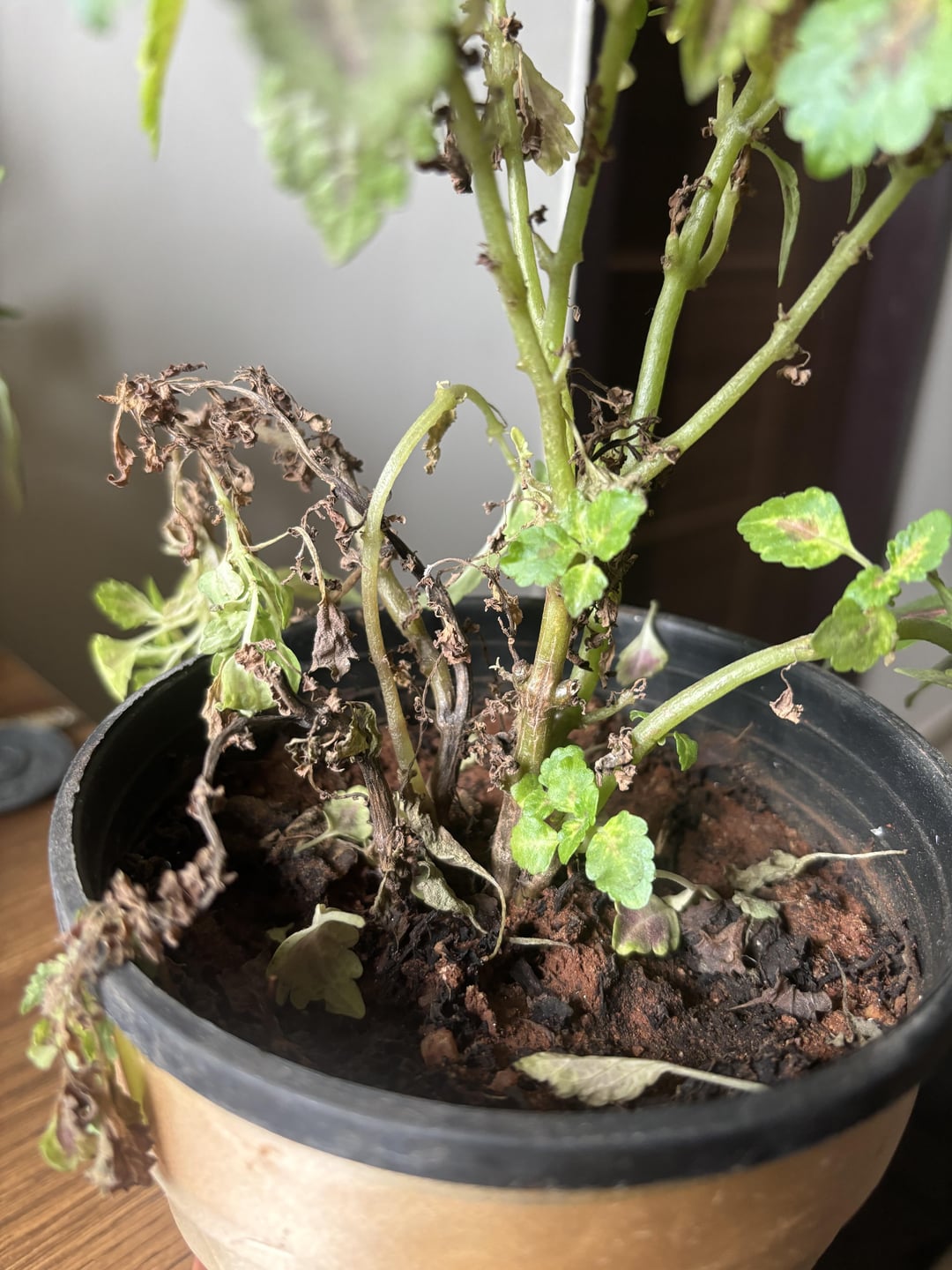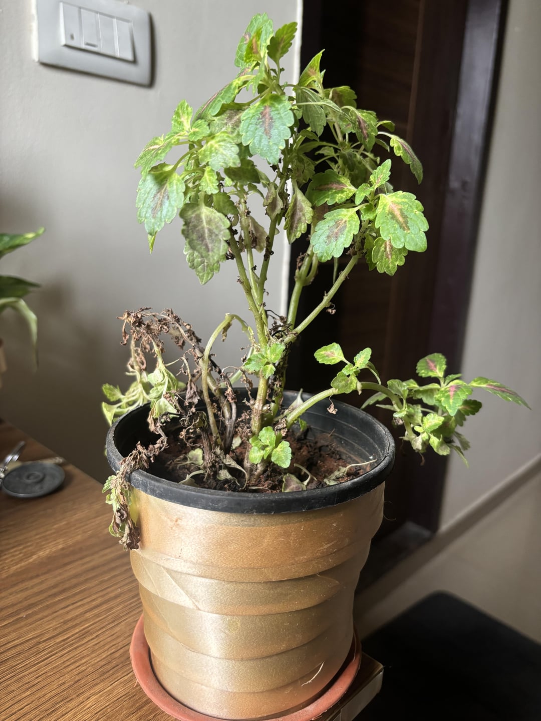 私のコリウスは、しばらく前から葉を落としています。以前はもっと密集していて、緑が濃かったのですが、茎の一部はすでに黒くなっていたので、捨ててしまいました。 日光 – 西向きの窓から間接的に日光がよく入ります 水やり – ほぼ1日おきに水をやります