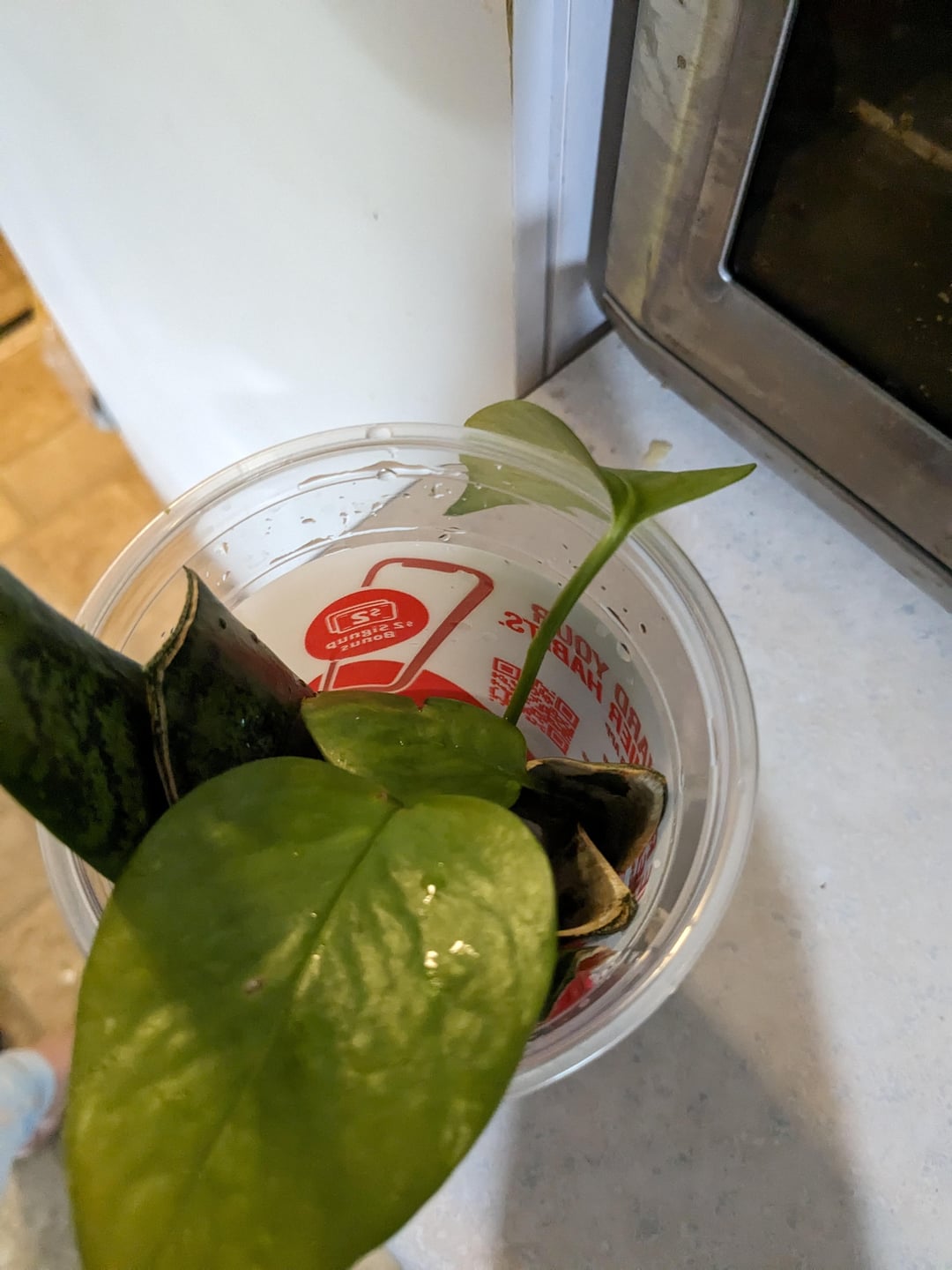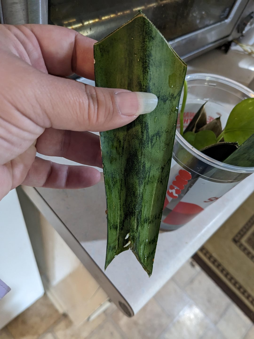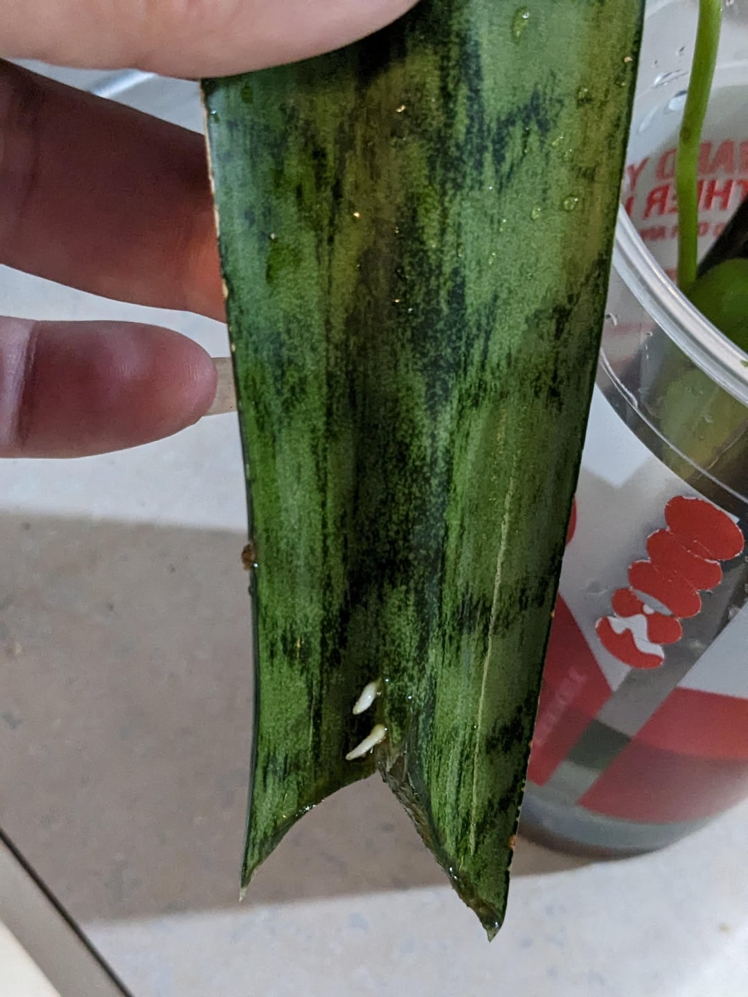 私の妹は古いヘビの植物を持っていますが、母がそれらを移動したときに葉が2枚曲がってしまいました。 もう壊れてしまったので大丈夫ですか、もらって試してもらえますか、とお願いしました。 これらは何週間も水の中に放置されていました。 これはまたひどい状況になるだろうと思い始めていました。 でも、見てください! そのうちの1つは、小さな小さな赤ちゃんの根を発芽させています。 少なくとも、しっかりした小道具が一つは手に入りそうです!!