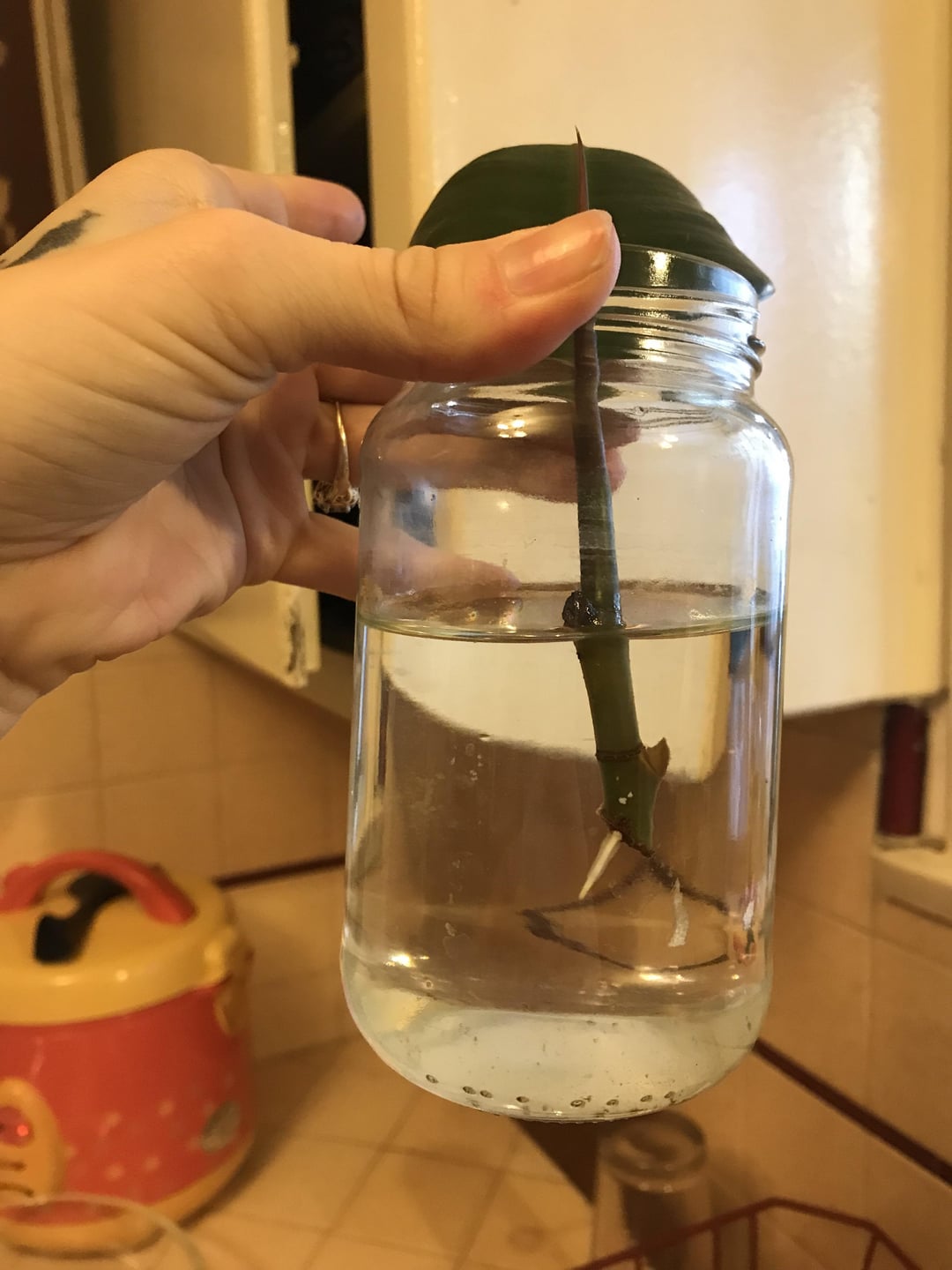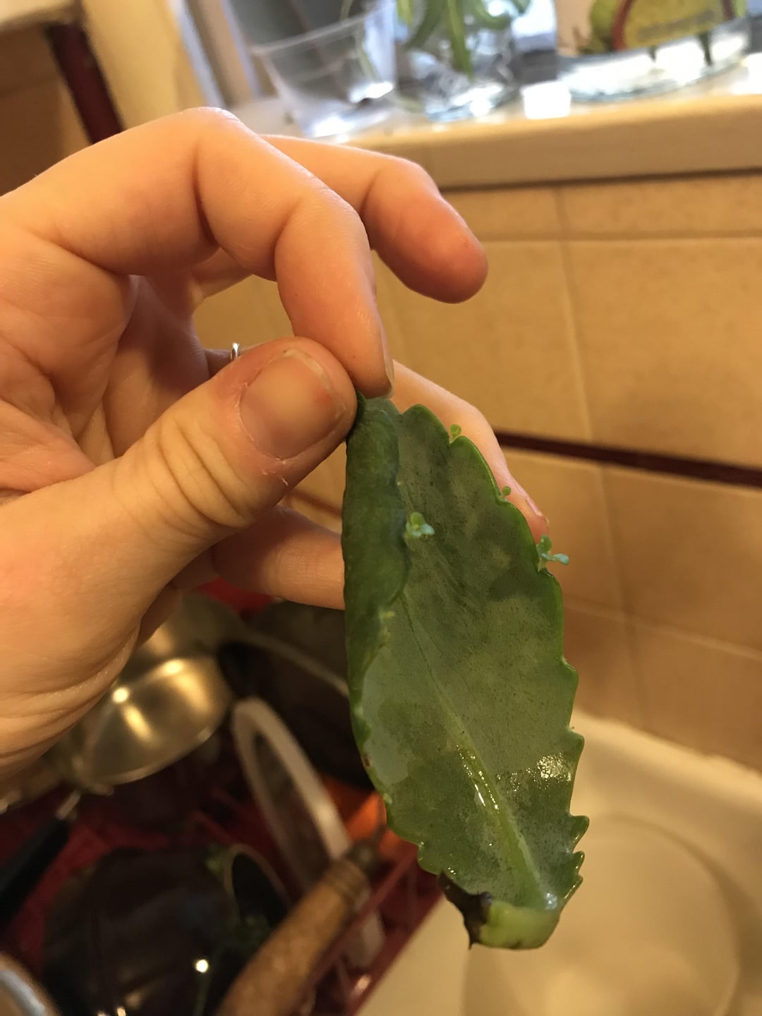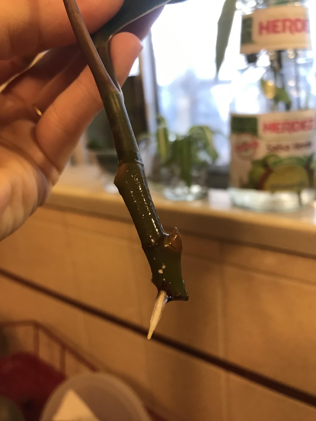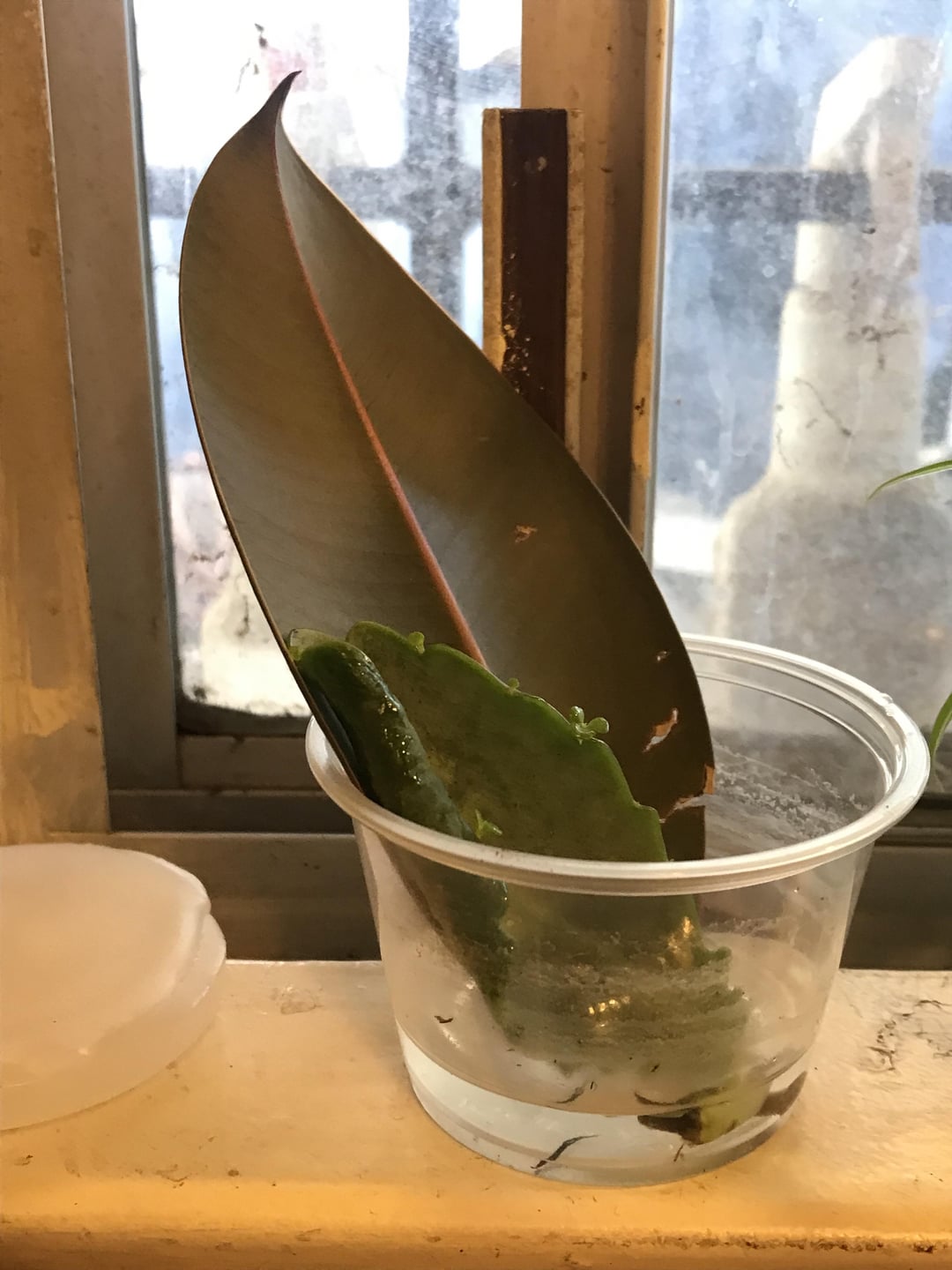 進捗状況と具体的なアドバイス…。 1ヶ月ほど前にこのゴムの木を挿し木しましたが、ようやく発根し始めました。 シナモンを「発根ホルモン」として初めて試しましたが、店で購入した発根ホルモンを使ったことがないので、効果があるのか何も効果がないのかわかりません。 私の質問は、いつ、どのように土に植えればよいでしょうか? 2番目のプログレスは、母が私にくれたこの多肉植物です。葉を無神経にし、毎日霧吹きをしても根が張らない状態にした後、葉を摘み取りました。希望を諦めて、別の試験用のゴムの木と一緒に水の入ったカップにそれを置きました。繁殖(水にシナモンを混ぜた葉を刺すだけです(笑))。 見よ、見よ! 多肉植物はあちこちで小さな赤ちゃんを育てています:) 🪂 この小道具についての質問: さてどうしますか? 赤ちゃんが成長するまで水カップに入れておきますか、それとも土に入れますか? また、赤ちゃんは茎からではなく葉の上で成長するので、土に埋める場合はどの部分を埋めればよいでしょうか?