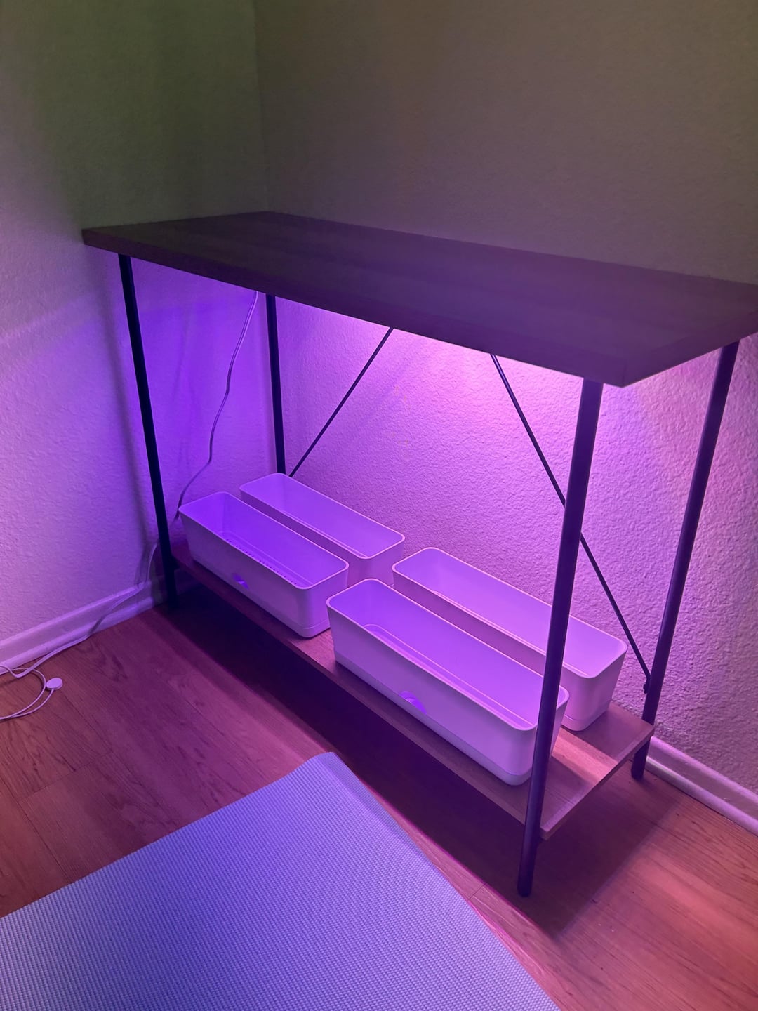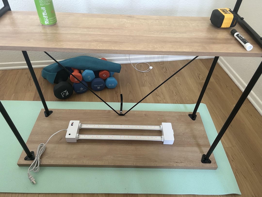 屋内で栽培ライトを使用するのは初めてなので、アドバイスがあればぜひお願いします。 初めての室内ハーブ園を始めたいのですが、窓のスペースが足りません。ホームデポに行って、テーブルのひとつを小さな栽培スペースに変えたのですが、これは大丈夫でしょうか? 光はプランターの上部から 18 インチのところにあります。 組み立てに関するヒントや批判があれば大歓迎です。長期的には熱や光が壁を傷めるのではないかと心配しており、安全にそれを防ぐために何かできることはないかと考えています。