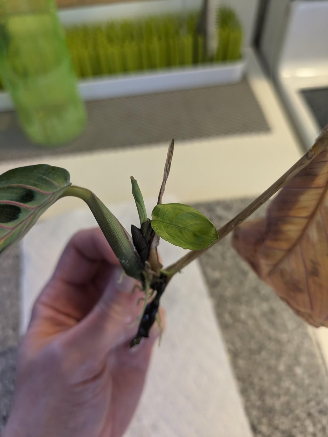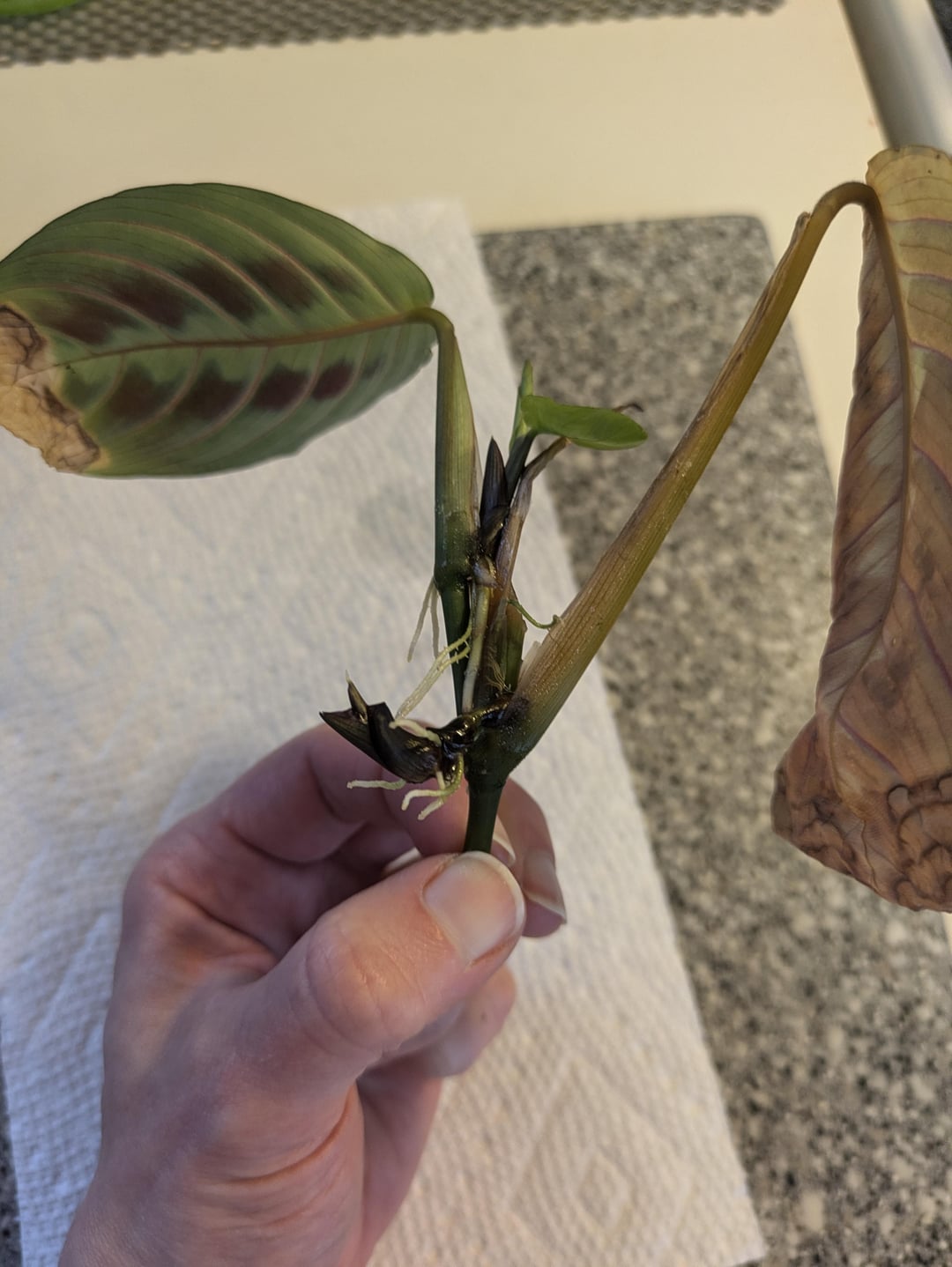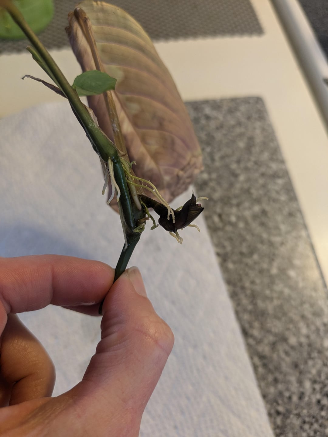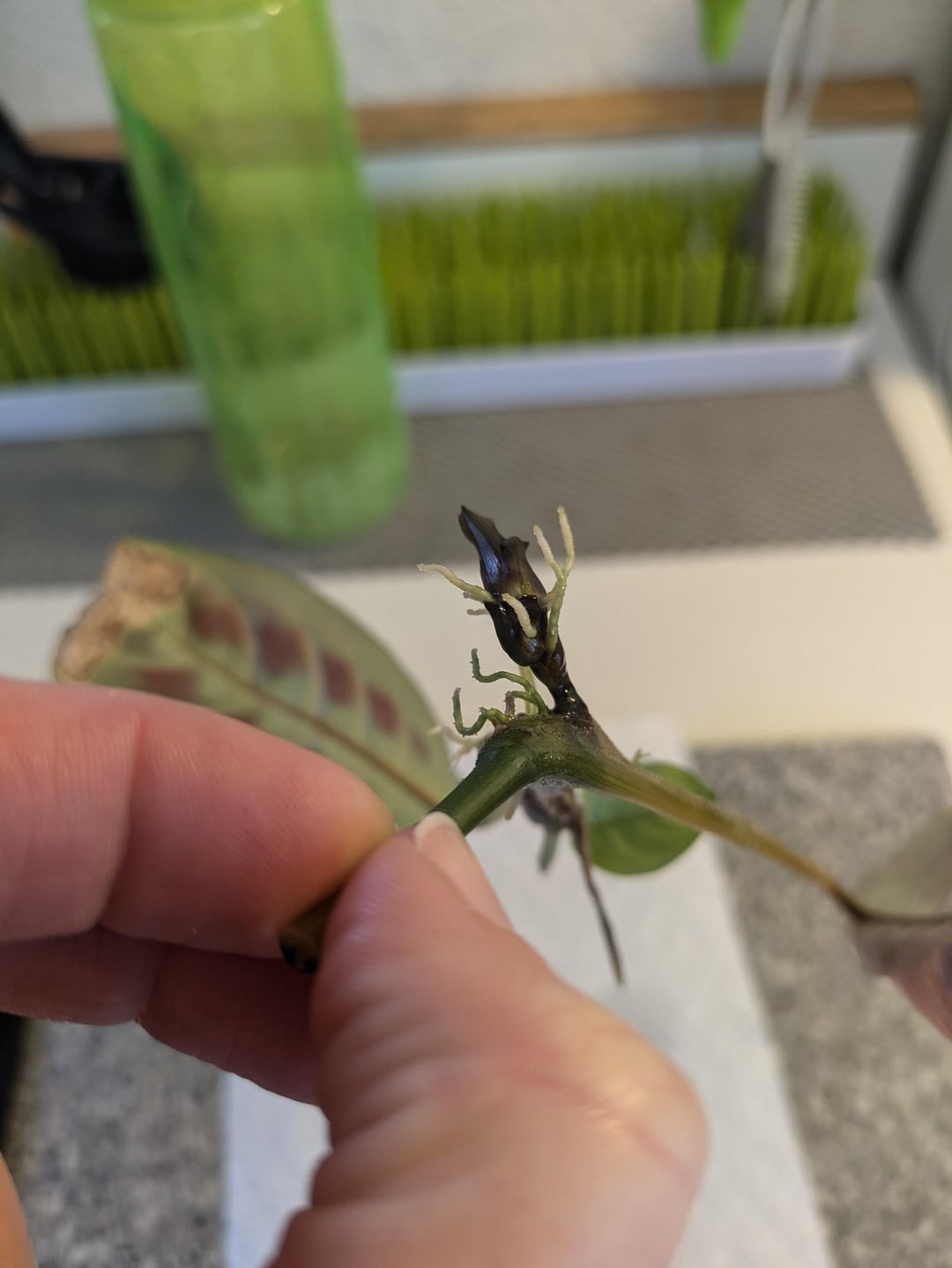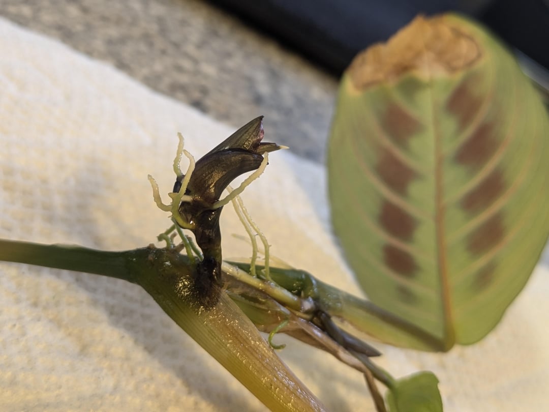 この挿し木は、他の兄弟とはまったく異なります。まず、葉っぱのような素材で覆われた大きな突起が生えているようです。この突起だけでなく、他のさまざまな場所から根が出ており、細くて小さな緑の芽もいくつか出ています。これは他のすべてにはまったく見られないものです。また、小さな葉も出てきて、次の葉を準備しているように見えます。