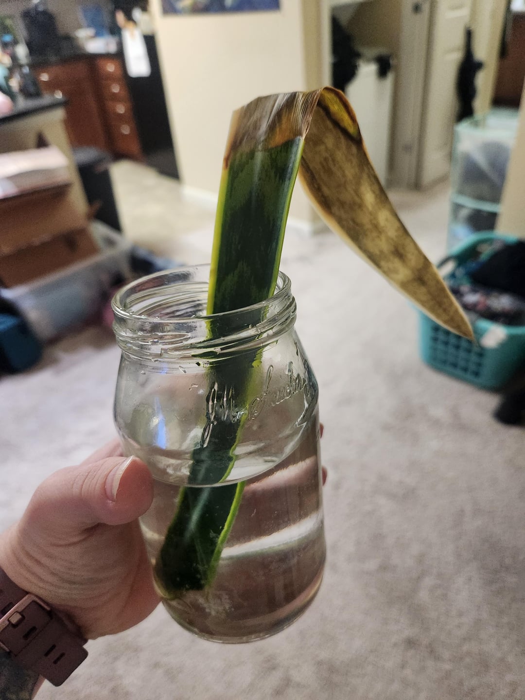 これは私のヘビ植物から繁殖したもので、上部はゆっくりと茶色に変わってきていますが、下部では発芽しています。 大丈夫、何か変えたほうがいいですか? そしていつ植えるのですか?