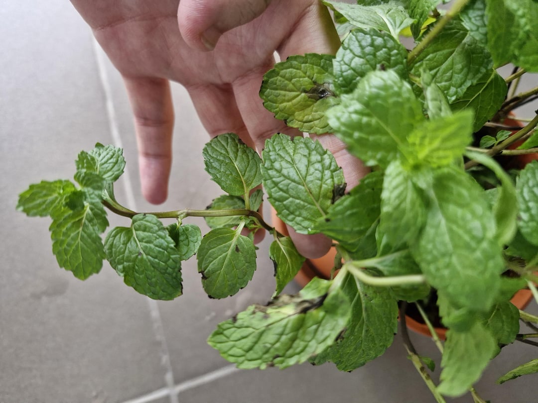 数日前にお店でスペアミントの苗を買って、ベランダに置いて日光が当たるようにしています。ここは外の気温が 27℃ から 33℃ です。直射日光が当たらないようにテーブルの下に鉢を置いています。屋外に置いていると乾燥しすぎるかもしれないと思ったので、毎日夜に 100 ml ほど水をあげています。