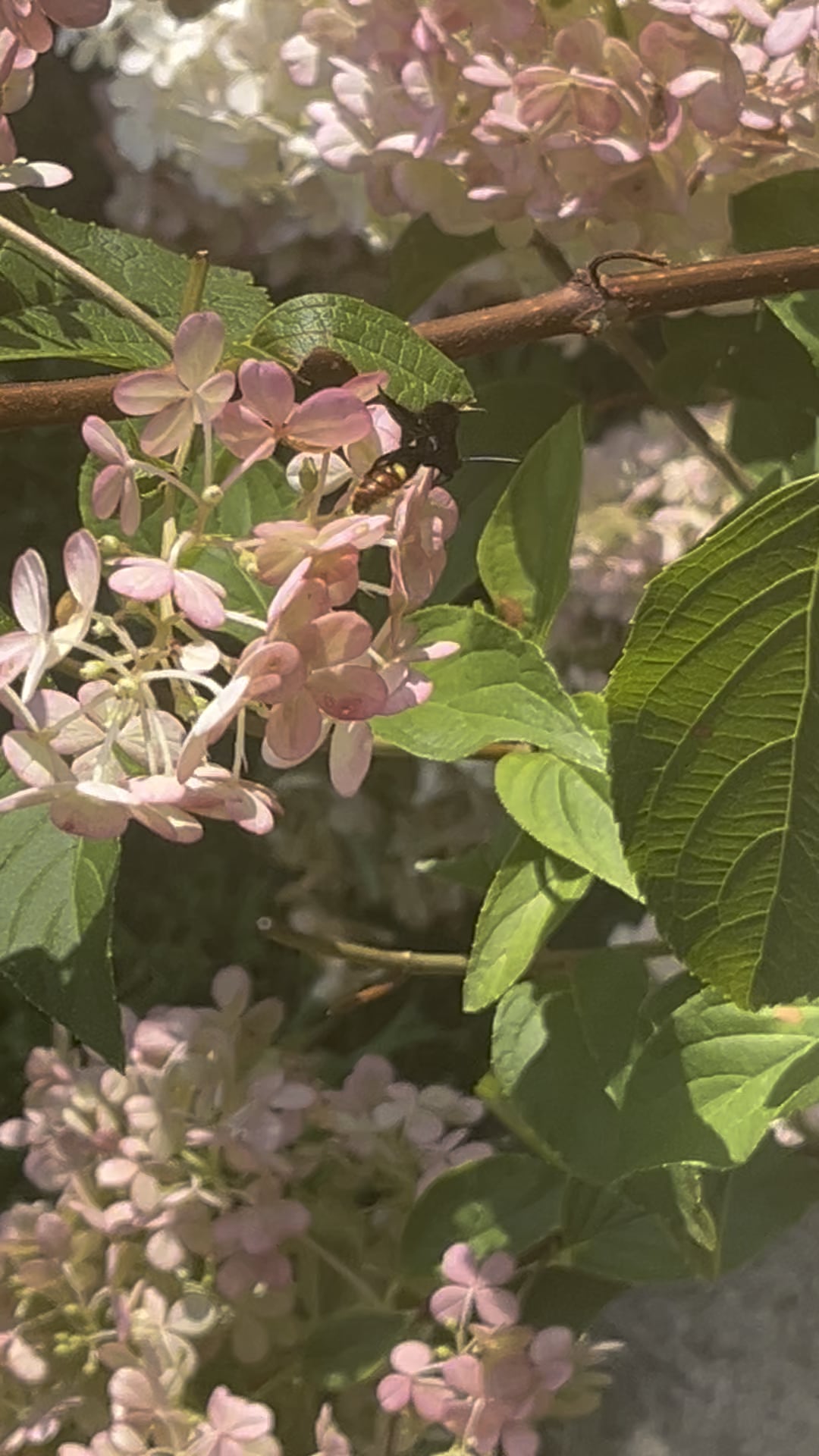 それらを特定するには少しの探偵が必要でした。これらの小さな虫は速いです。 Googleは、青い翼のあるスズメバチは孤立した有益な花粉媒介者であると言います。それは日本のカブトムシや他の種類の硬い殻を狩る寄生スズメバチです。彼らは彼らの上に卵を産みます。