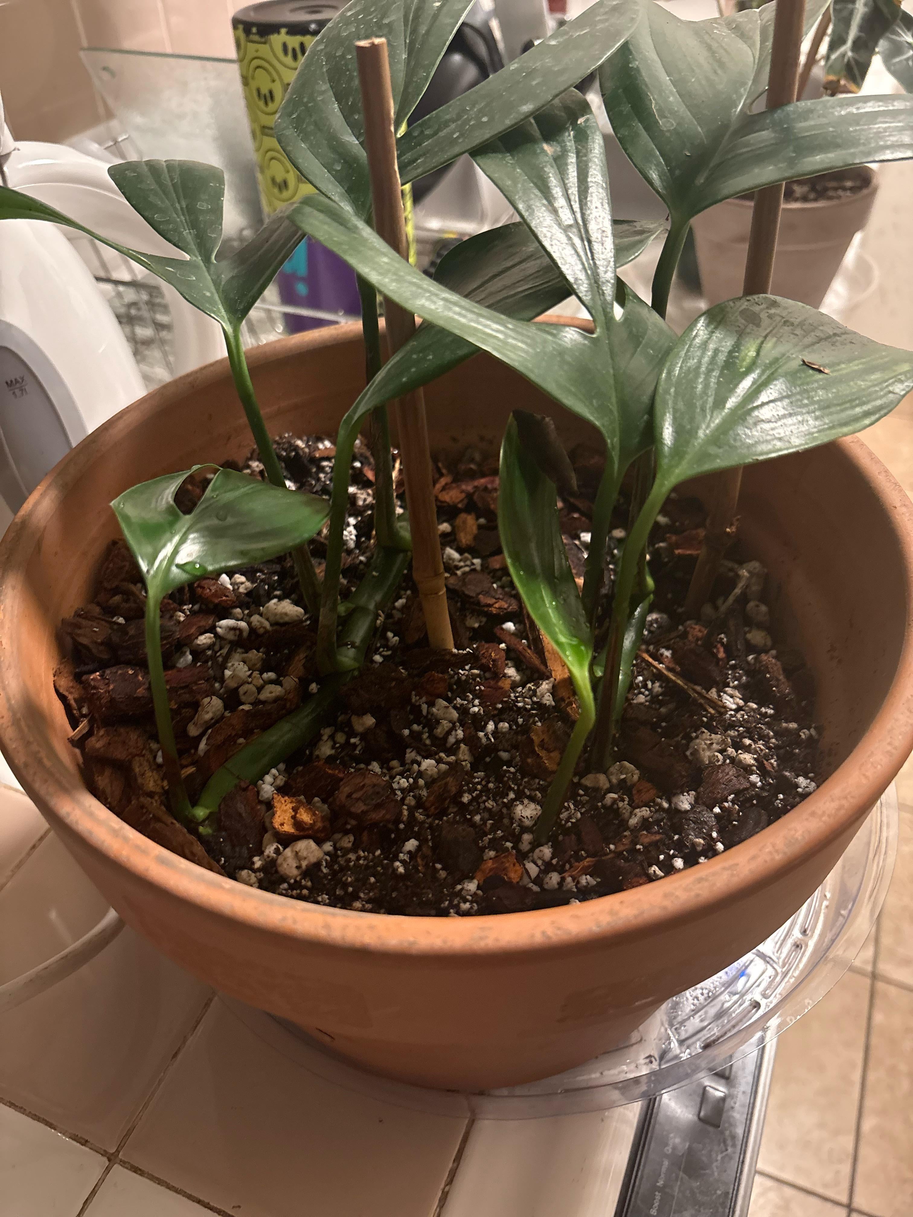 皆さん、こんにちは。タイトルにあるように、私の家の近くの地元の植物苗床には、30 年以上経営していたオーナーが最近亡くなりました。彼の子供たちは残りの在庫を売却することを選択しました。彼は生き残った植物の挿し木を水の中に残していて、根がいっぱいでした。この鉢と同じように 2 つ購入し、土に少し埋めて根を張り、小さな竹の棒 2 本で葉を直立させました。